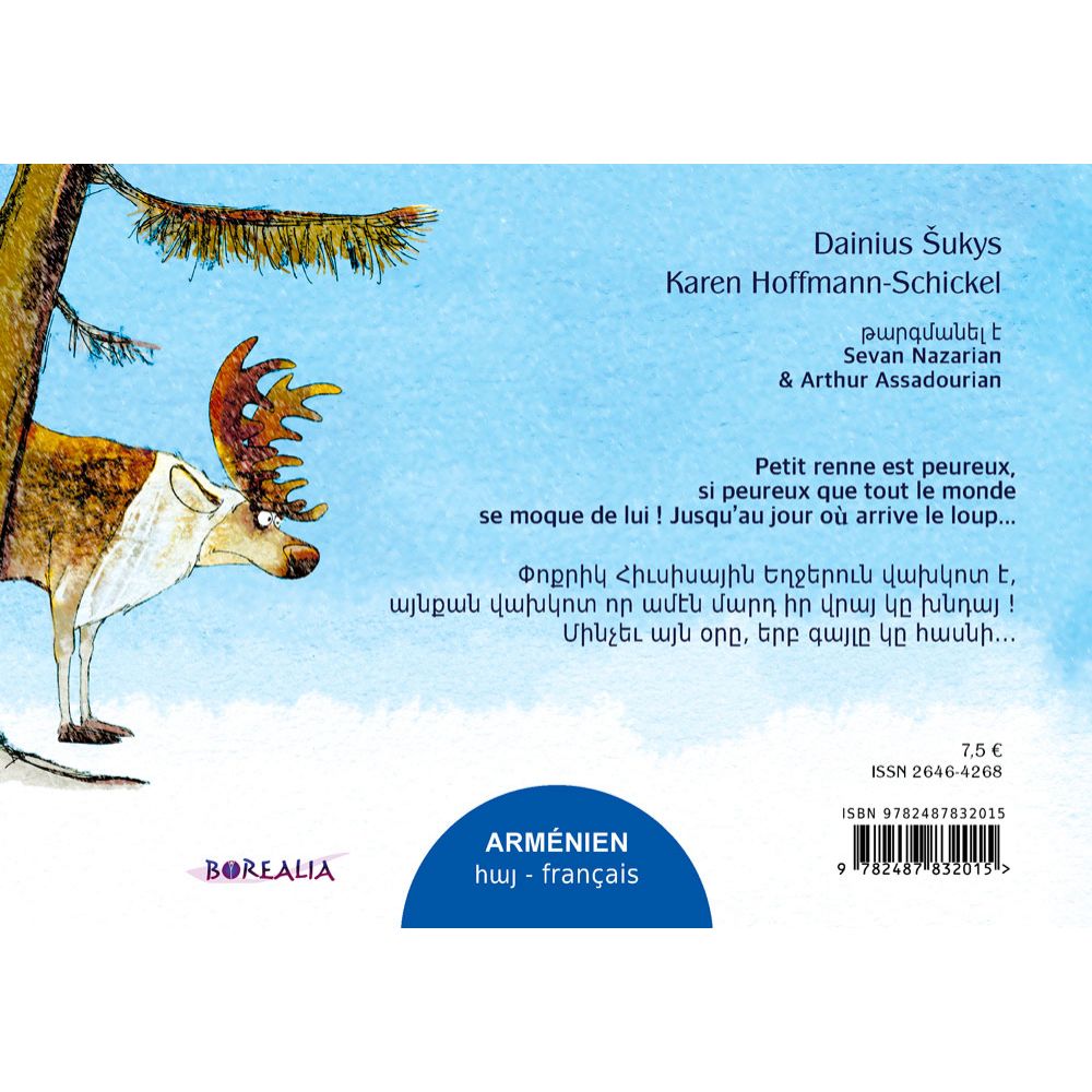 Փոքրիկ Հիւսիսային Եղջերուն վախկոտ է, այնքան վախկոտ որ ամէն մարդ իր վրայ կը խնդայ ! Մինչեւ այն օրը, երբ գայլը կը հասնի… Petit renne est peureux, si peureux que tout le monde se moque de lui ! Jusqu’au jour où arrive le loup… Petit renne a peur de tout version bilingue arménien-français.